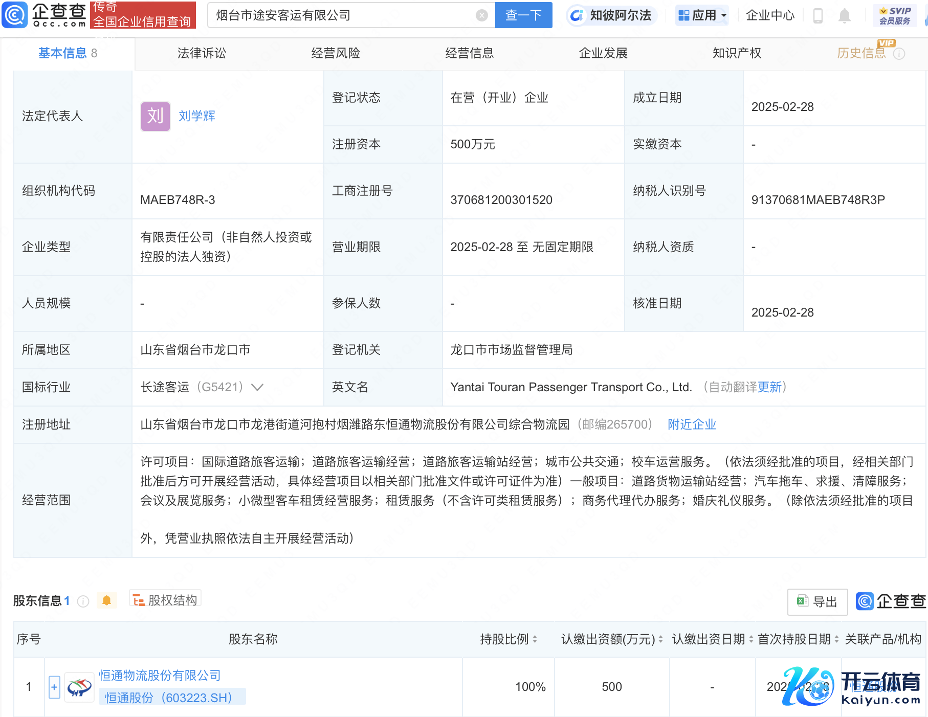 企查查APP理解,近日,烟台市途安客运有限公司教育开yun体育网,法定代表东谈主为刘学辉,注册本钱500万元,探究界限包含:海外谈路游客运载;谈路游客运载探究;谈路游客运载站探究;城市众人交通等。企查查股权穿透理解,该公司由恒通股份(603223)全资抓股。