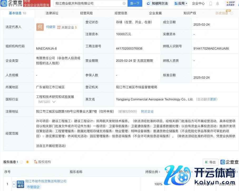 企查查APP表露,近日开yun体育网,阳江交易航天科技有限公司建筑,法定代表东谈主为何健荣,注册老本1亿东谈主民币,指标限度含民用航天辐射技巧做事、卫星导航做事、卫星通讯做事等。企查查股权穿透表露,该公司由阳江市城市投资集团有限公司全资合手股。