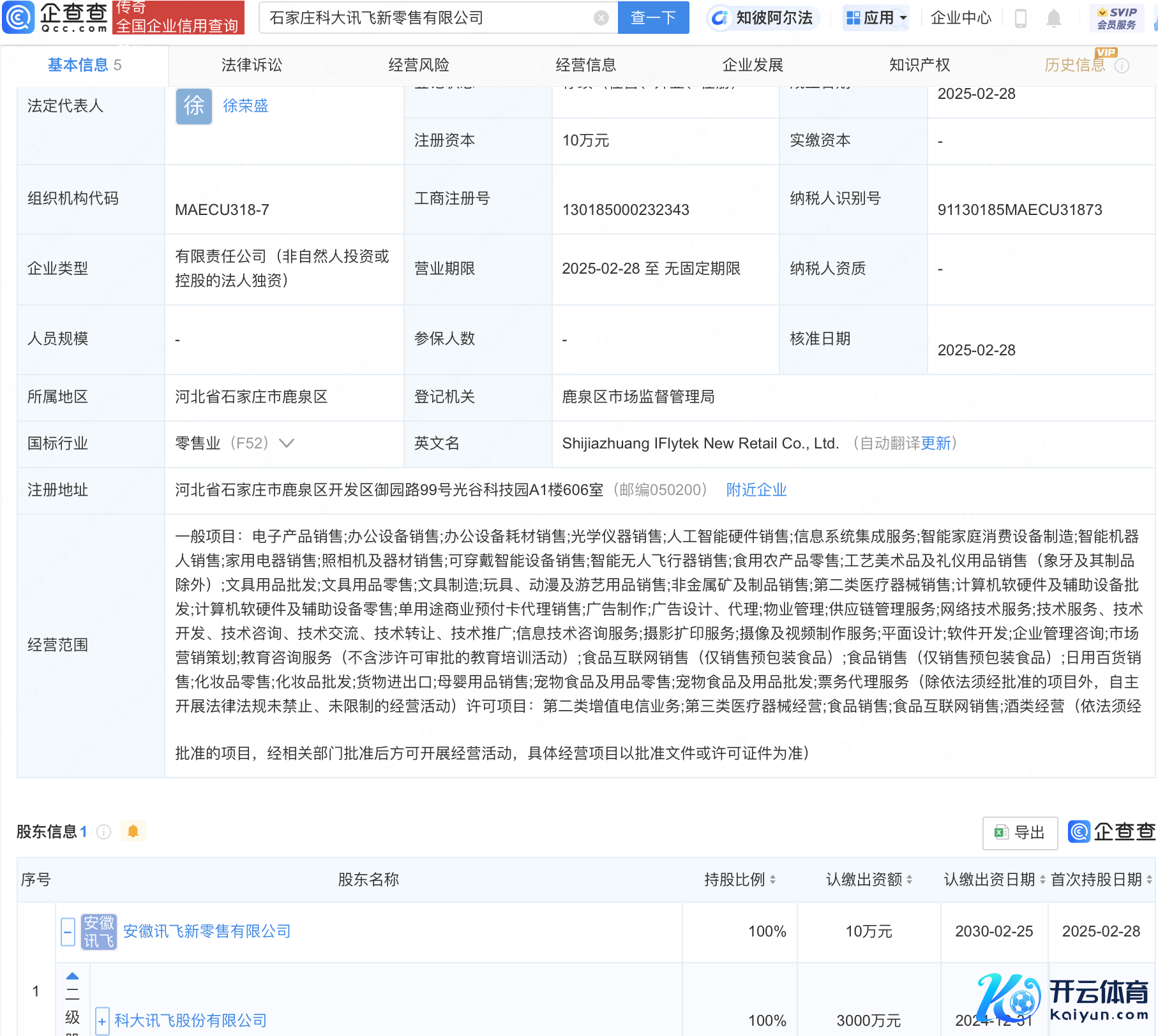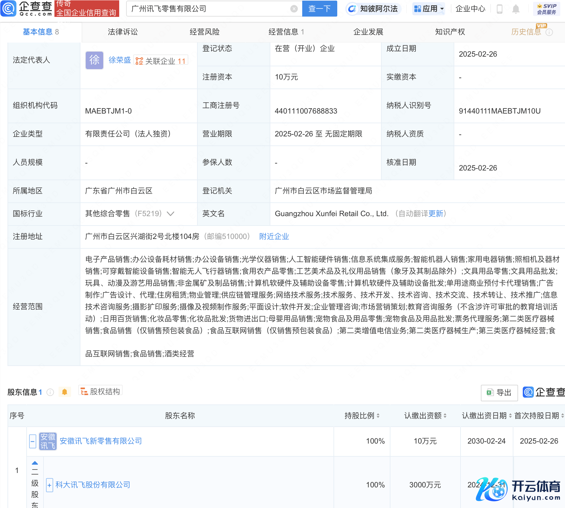企查查APP露馅,近日,广州讯飞零卖有限公司、石家庄科大讯飞新零卖有限公司成就,法定代表东说念主均为徐荣盛,注册老本均为10万东说念主民币,探究范围包括东说念主工智能硬件销售、智能家庭消耗开导制造、智能机器东说念主销售、智能无东说念主翱游器销售等。企查查股权穿表露馅,上述公司均由科大讯飞(002230)旗下安徽讯飞新零卖有限公司全资执股。值得翔实的是开yun体育网,不久前,科大讯飞已在成齐、杭州成就新零卖公司。