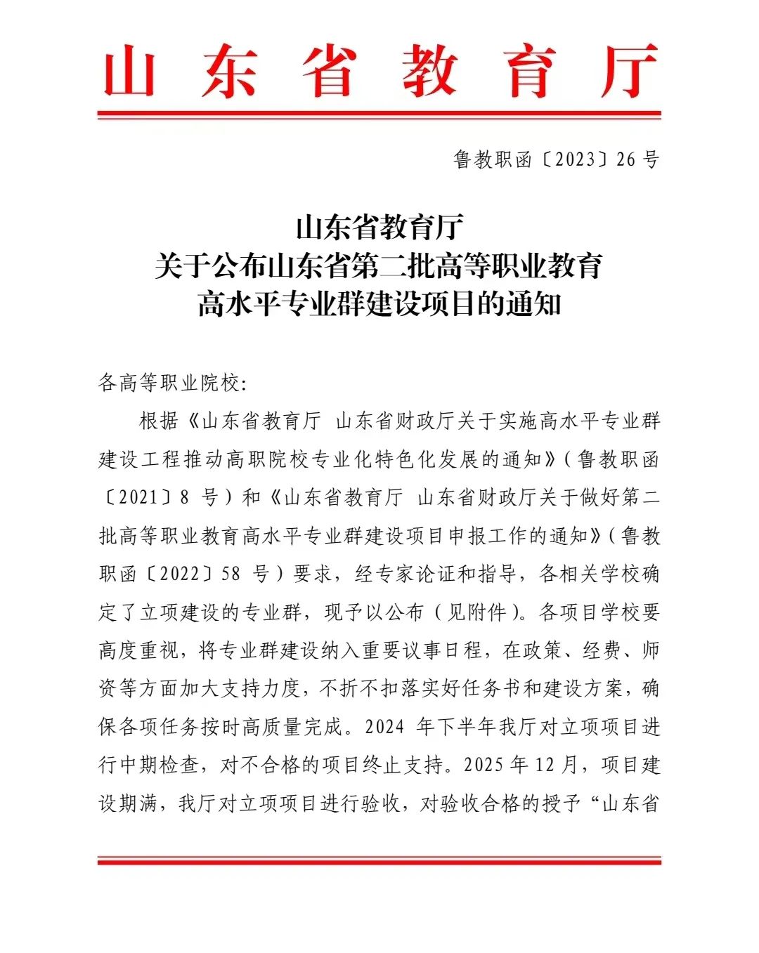日前,山东省教育厅发布《关于公布山东省第二批高等职业教育高水平专业群建设项目的通知》,必赢766net手机版会计系的数智财经专业群被立项为第二批省级高水平专业群项目。学校拥有的省级高水平专业群达到5个。