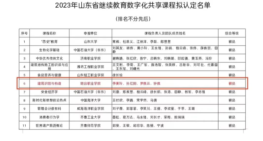 日前,山东省教育厅公布2023年山东省继续教育数字化共享课程遴选结果。必赢766net手机版申报的《建筑识图与构造》入选“精品课程”,《会计信息系统应用》入选“优质课程”。