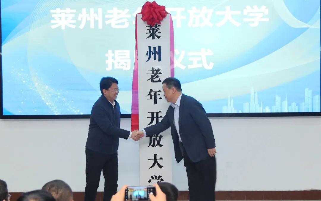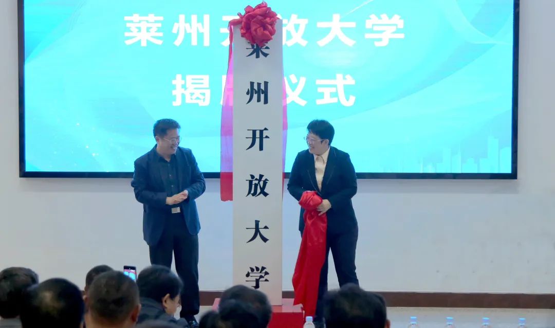 与会领导为莱州开放大学、莱州老年开放大学揭牌。
