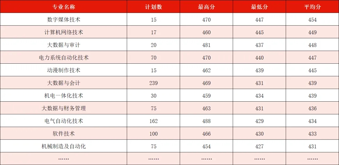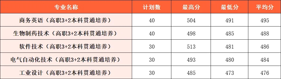 高职3+2本科贯通培养专业共招生170人,录取最高分513分,超一段线69分,较去年提高29分,录取最低分473分,超一段线29分,较去年提高9分,录取平均分486分。
