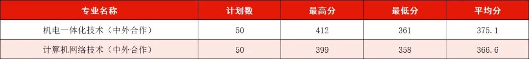 中外合作办学2个专业共招生100人,录取最低分较去年提高20分,录取平均分较去年提高16分。